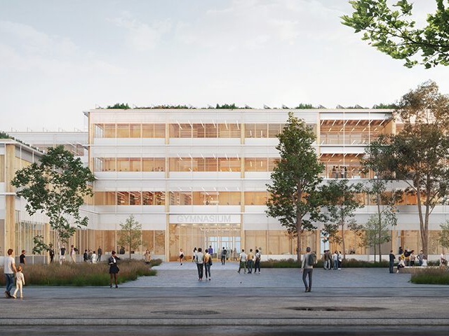Der neue Schulbau formt mit dem Bestandsgebäude einen weitläufigen Pausenhof, auf dem Bäume gepflanzt und Grüninseln angelegt werden. Auf den Holzpodesten können die Kinder ihre Pausenbrote essen und eine Verschnaufpause einlegen. Das gesamte Schulgelände ist barrierefrei gestaltet. Eine Besonderheit des Schulgeländes ist die große naturbelassene Fläche mit natürlichem Baumbestand. Hier finden sich auch der Schulgarten, das grüne Klassenzimmer und der Spielparcours. Das grüne Klassenzimmer mit seinen Sitzstufen kann auch für Veranstaltungen und Aufführungen genutzt werden, gerade in Corona-Zeiten eine gute Alternative zur Aula.